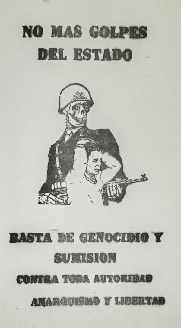 Muy poco se ha historiado sobre las actividades anarquistas en esa oscura época. Del movimiento de la FORA hay mucho menos, sobreviviente de todas las dictaduras anteriores, sabemos que dos años antes del golpe fueron atacados dos locales vinculados a ella, el incendio de la biblioteca Emilio Zola en Santa Fe y la voladura del local de la FORA de Villa constitución donde se reunía una agrupación sindical opositora de la UOM, ambos atentados vinculados a grupos parapoliciales, pero estos ataques no fueron directamente contra la FORA. Para la época del golpe existían comisiones administrativas de la sociedad de Plomeros, Sociedad de resistencia de portuarios, Comité pro Presos y S.R. de Oficios Varios de la capital todas muy debilitadas, el 1° de Mayo del ‘76 se intentó realizar un acto público en el local de la Boca y la policía irrumpió llevándose detenidos a 4 compañeros y requisando periódicos y libros de la organización, clausurando dicho local por cinco años. En julio de ese año a través del periódico “La Protesta” que circulaba clandestinamente publica el comité Por Presos de la FORA un pedido de libertad para dos compañeros secuestrados por coordinación Federal, después de eso solo encontramos boletines extraordinarios de “Organización Obrera” en septiembre y diciembre de 1976 y la edición normal pero clandestina de diciembre de 1977, donde se siguió denunciando a los militares y sus cómplices. Poco más sabemos de las condiciones en que estuvo la FORA en esa etapa hasta los intentos de normalización a fines del ‘83. Es difícil desde la distancia de tantos años juzgar acciones o procedimientos de esos compañeros en medio de semejante terror general impuesto. El terrorismo de Estado fue, en esencia, la condición de posibilidad para un plan económico que concentró la riqueza, endeudó al país y destruyó el entramado industrial y social, cuyas consecuencias aún se sienten hoy. Toda esta historia es probablemente ya sabida pero es bueno recordarla para quienes relativizan al fascismo se llame como se llame en la actualidad y para no olvidar que la esencia del poder es el crimen. Milicos en las calles nunca más.